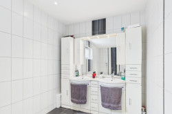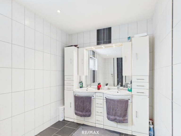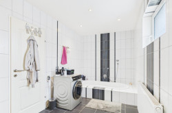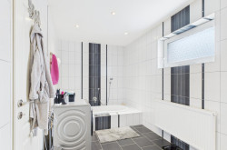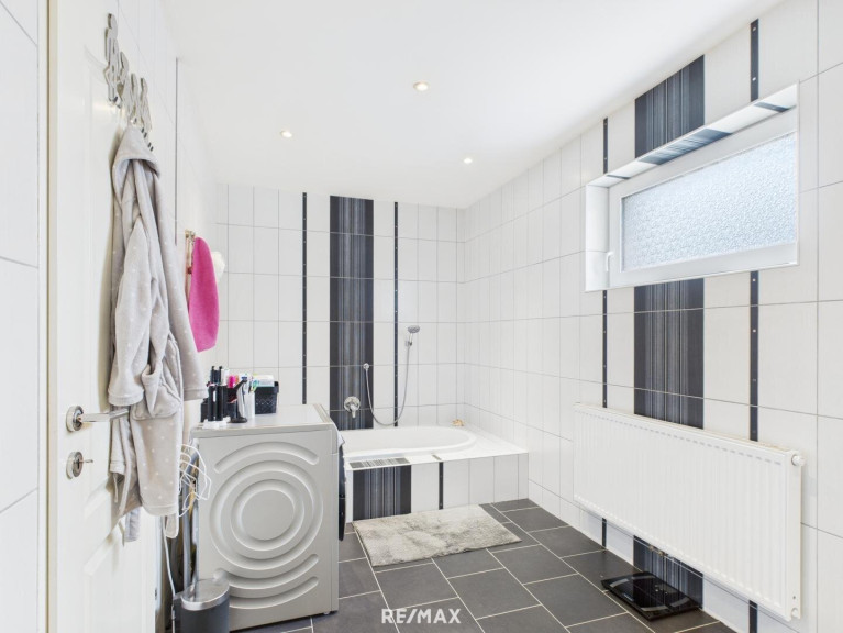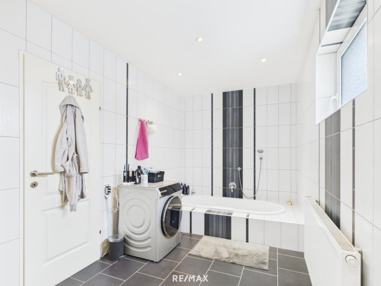 - großzügiges Badezimmer mit Badewanne, Doppelwaschtisch, Waschmaschinenanschluss und Fenster
