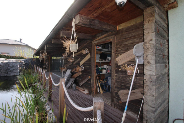 GARTEN: Terrasse vor dem Haus und Sommerhaus , Schwimmteich mit Wasserfall und Holzterrasse, Sommerhaus mit großem Aufenthaltsbereich und Nassräumen, sowie zwei Abstellräume.