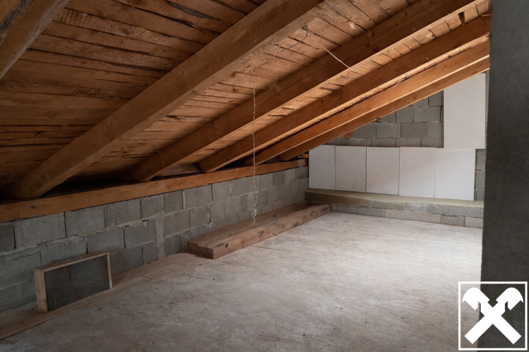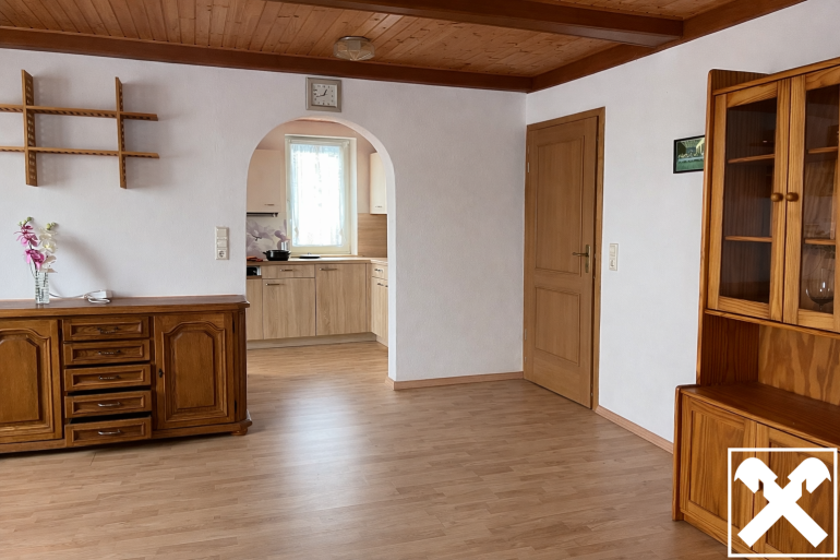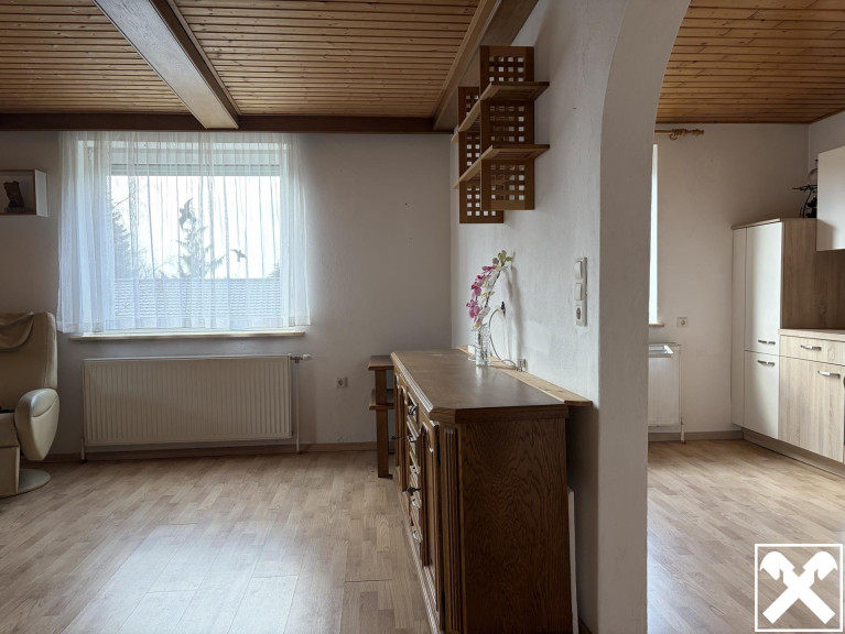 Das Haus verfügt über ein Schlafzimmer, ein großzügiges Wohnzimmer sowie eine moderne Küche, ein Badezimmer, ein WC und bietet Potenzial, um es nach eigenen Vorstellungen weiter auszubauen oder zu gestalten. Eine Garage, ein Keller, Wasser- und Kanalanschluss sowie eine neuwertige Ölheizung sorgen für praktischen Komfort. Mit der Sanierung der Kellerräume wurde bereits begonnen. Die Gartenhütte bietet zusätzlichen Stauraum.