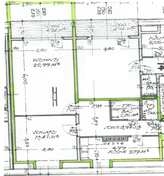 Wohnzimmer mit Loggia, Schlafzimmer, Einbauküche, Vorzimmer,