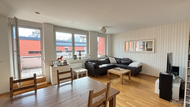 Diese Dachgeschosswohnung überzeugt durch ihre seltene Kombination aus großzügiger Wohnfläche, zwei Terrassen, durchdachter Raumaufteilung und inkludiertem Garagenplatz.