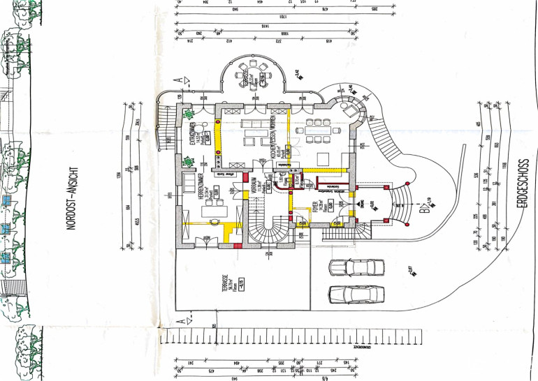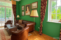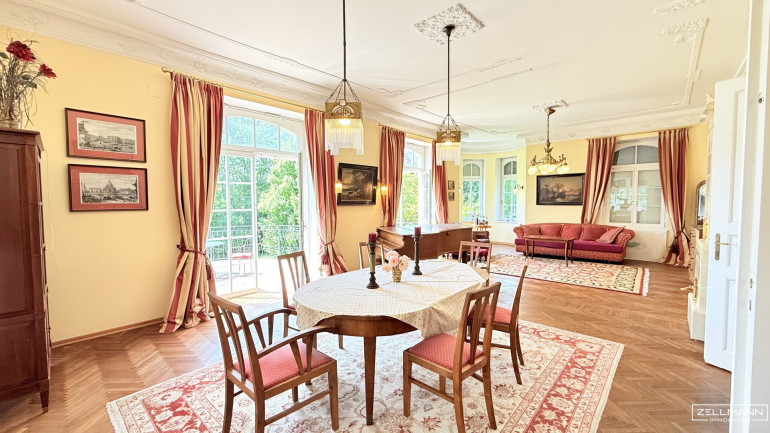 Erdgeschoss: Großzügiges Foyer mit WC und Abstellraum, beeindruckendes Stiegenhaus, weitläufiger Ess- und Wohnbereich mit Jugendstil Kachelofen, angrenzende stilvolle Küche, Herrenzimmer mit offenem Kamin, Zugang zu den Terrassen aus allen Zimmern.