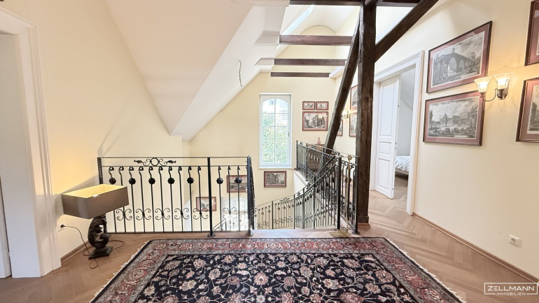 Obergeschoss: Galerie mit Stiegenaufgang, Master-Schlafzimmer mit angrenzendem Badezimmer und Ankleideraum und Jugendstil Kachelofen, zwei weitere Schlafzimmer und ein weiteres Badezimmer und ein weiterer Ankleideraum.