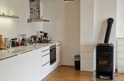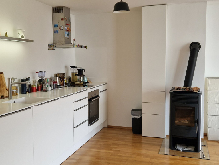 Wohnküche: Die Einbauküche von DAN bietet Ihnen genügend Stauraum und ist mit allen notwendigen Geräten (Siemens) ausgestattet, um auch größere Kochprojekte zu meistern. Sie bietet ausreichend Platz für einen Esstisch und eine gemütliche Ecke, um die wohlige Wärme des Holzofens zu genießen.