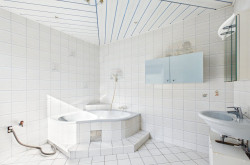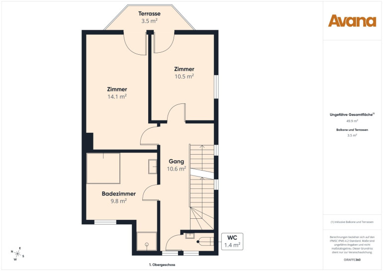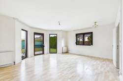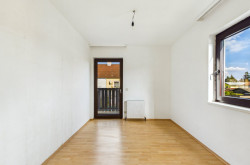 Das Obergeschoss ist ganz dem Rückzug und der Erholung gewidmet. Zwei helle Zimmer bieten vielseitige Nutzungsmöglichkeiten – ob als Kinderzimmer, Gästezimmer oder Homeoffice. Beide Räume verfügen über Zugang zur holzverkleideten Terrasse. Das Badezimmer mit charakteristischer Eckbadewanne und Dusche bildet eine solide Grundlage für den Alltag, während ein zusätzliches separates WC den Wohnkomfort dieser Ebene abrundet.