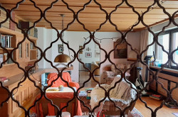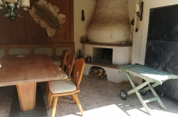 - romantische Loggia mit Fußbodenheizung, offenem Kamin, Holzverkleidung mit Holzschnitzarbeiten, die offen zum Garten hin gestaltet ist