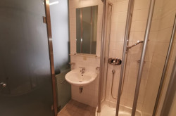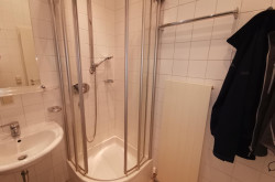> Badezimmer mit Dusche, Waschmaschine und Toilette