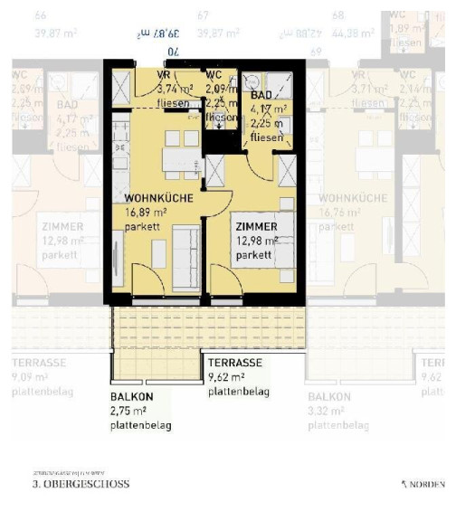 Sollten Sie mehr Platz benötigen, planen wir auch gerne eine größere Wohnung (zB eine 4-Zimmer-Wohnung anstelle von zwei nebeneinander liegenden 2-Zimmer-Wohnungen) für Sie. Fragen Sie einfach bei unserem Vertrieb nach!