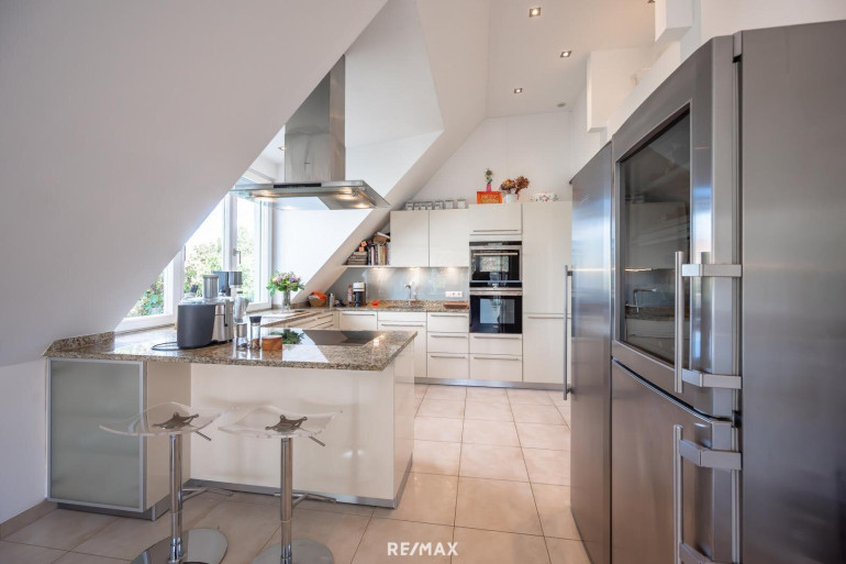 Das Obergeschoss besticht durch einen lichtdurchfluteten Wohnsalon mit offenem Kamin, eine offen gestaltete Designküche mit Essbereich sowie zusätzliche Lagermöglichkeiten. Das absolute Highlight: Die oberste Dachterrasse mit unverbaubarem Wien-Blick und einem Pool mit Edelstahlbecken und Gegenstromanlage – exklusiver lässt sich Entspannung kaum inszenieren.