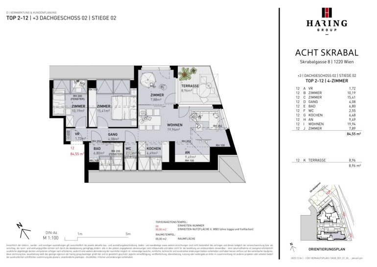Im Wohnbauprojekt ACHT SKRABAL in der Skrabalgasse 8, 1220 Wien entstehen 33 moderne Eigentums- und Vorsorgewohnungen mit 2–4 Zimmern und Wohnflächen von 39 bis 93 m², jeweils mit einer privaten Freifläche – Balkon, Terrasse oder Garten.