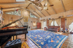 Herzstück: der spektakuläre Wohn-/Familienraum mit einem etwa 30 ft (≈ 9,1 m) hohen kathedralartigen Holzbalken-Deckenbau