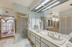 Luxuriöses Hauptbad mit Jacuzzi-Wanne, großem gefliesten Duschbereich, zwei Waschbecken und Schminktisch