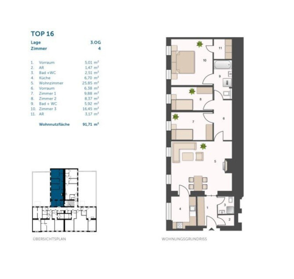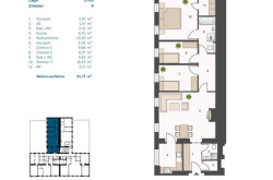 Die Wohnung gliedert sich in ein Wohnzimmer mit anschließender, separater Küche, drei Schlafzimmer (zwei davon zentral begehbar und eines mit angrenzendem Schrankraum), sowie zwei Bädern, einen Abstellraum und einem Vorraum.