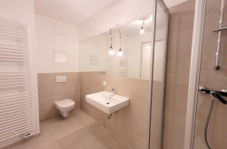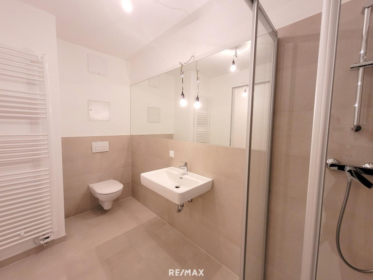 - Bad mit Dusche und WC, modern mit großen Fliesen und schönen Armaturen, Waschmaschinenanschluss