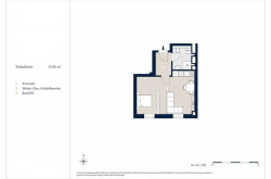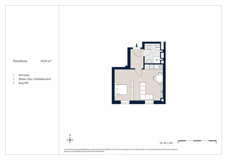 Der offen konzipierte Wohn-, Schlaf- und Essbereich bietet eine klare, gut nutzbare Raumstruktur und ausreichend Platz für modernes Wohnen. Die großflächigen Fenster sorgen für ein angenehmes, natürliches Licht und einen freien Blick ins Grüne. Das Badezimmer ist funktional ausgestattet und verfügt über Dusche, WC sowie einen Waschmaschinenanschluss.