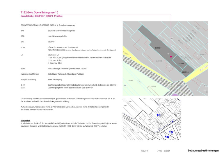 Der Baugrund (Bauland - gemischtes Baugebiet) in 7122 Gols / Burgenland liegt zentrumsnah. Zudem ist die Anbindung an den öffentlichen Nah- und Fernverkehr durch den nahegelegene Bahnhof optimal. Man ist in 56 Min. mit dem Zug in Wien. Oder mit dem Auto über den nahegelegenen Autobahnanschlussstelle der A4 (Exit 51).Beschreibung der Immobilie