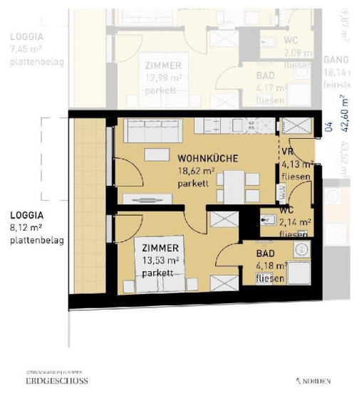 Sollten Sie mehr Platz benötigen, planen wir auch gerne eine größere Wohnung (zB eine 4-Zimmer-Wohnung anstelle von zwei nebeneinander liegenden 2-Zimmer-Wohnungen) für Sie. Fragen Sie einfach bei unserem Vertrieb nach!