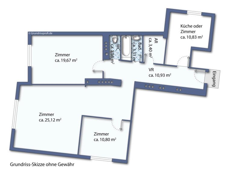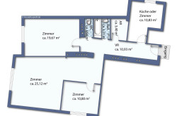 Aktuell hat die Wohnung den Grundriss einer 3 Zimmer-Wohnung mit einer extra Küche. Eine 4 Zimmer-Variante könnte durch die Nutzung der Küche als Kinderzimmer oder Arbeitszimmer entstehen. Auch eine Variante mit einer großen Wohnküche durch Zusammenlegung von zwei Zimmern ist denkbar. Die Prüfung der Umsetzbarkeit liegt bei Ihnen! Alle Vorschläge zur Grundriss-Änderung ohne Gewähr - vorbehaltlich der Prüfung der technischen und statischen Machbarkeit und allfälliger Bewilligungen.
