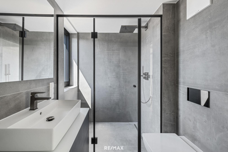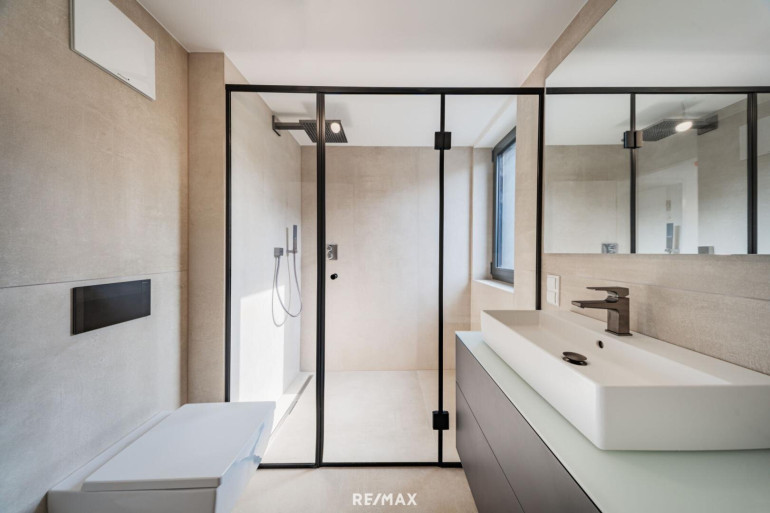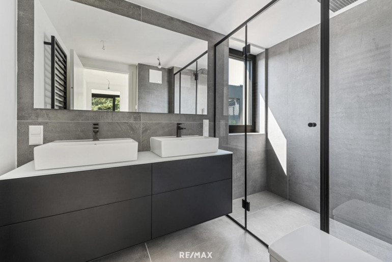 Obergeschoß: 2 Schlafzimmer, Bad mit Doppelwaschbecken, Dusche und WC, 7 m² Balkon