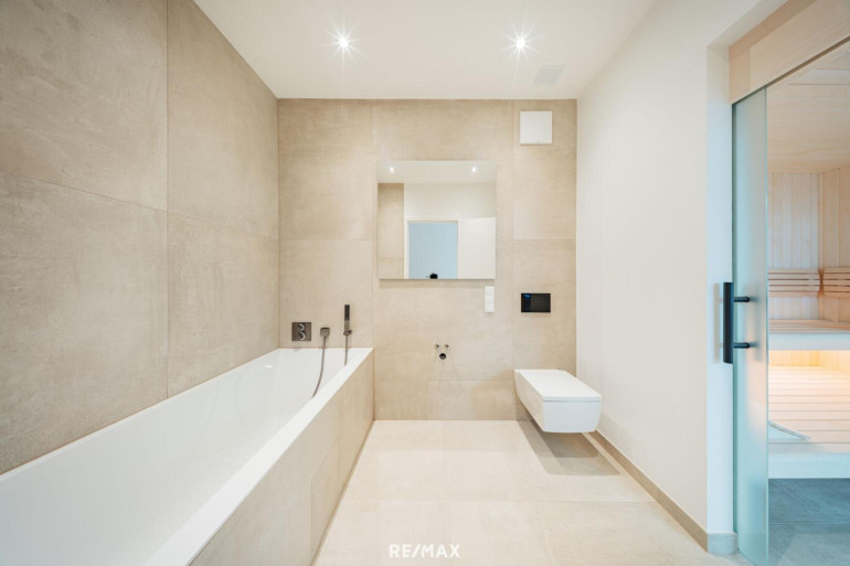 Untergeschoß: Schlafzimmer, Bad mit Dusche, Wanne und WC, Sauna, Ruhebereich mit Dusche, Technikraum, WC, Zugang zum Pool und 192 m² Garten