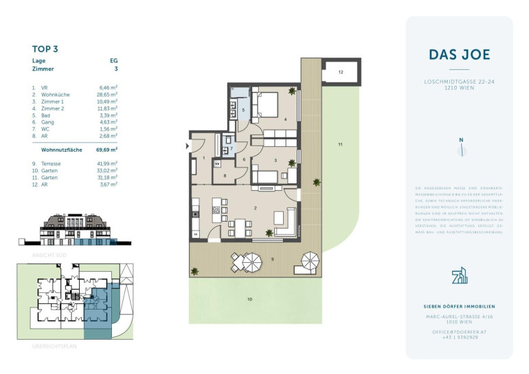Im Neubauprojekt DAS JOE in 1210 Wien, gelangt eine hochwertig ausgestattete 3-Zimmer-Wohnung mit großzügigen Freiflächen zum Verkauf. Auf ca. 69,7 m² Wohnfläche bietet die Wohnung eine optimale Raumaufteilung mit offener Wohnküche, zwei Schlafzimmern sowie Zugang zu einer ca. 42 m² großen Terrasse und einem ca. 64,2 m² großen Eigengarten.