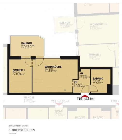 Am Drygalskiweg 59 in 1210 Wien entstehen 74 Eigentums- Vorsorgewohnungen in den Größen 39m² bis 87m² und 2, 3 bzw. 4 Zimmern. Egal ob Sie als Single, Pärchen oder Familie einziehen, Sie werden sich hier wohl fühlen. Die durchdachte Raumaufteilung deckt alle Bedürfnisse ab, die jeweiligen Freiflächen - Garten, Dachterrasse, Terrasse, Loggia, Balkon - bieten privaten Platz auch im Freien.
