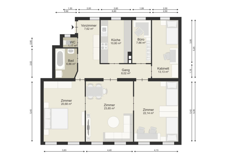 Zur damaligen Zeit als klassischer Altbau hergestellt und in großzügige Räume aufgeteilt, die im Urzustand damals schon separat begehbar waren, wo es bei vielen noch die typischen Durchzimmer gab.