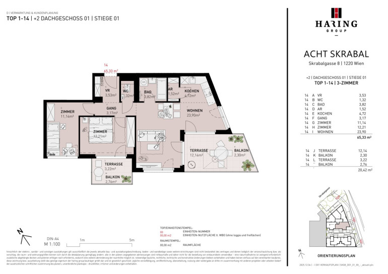 Im Wohnbauprojekt ACHT SKRABAL in der Skrabalgasse 8, 1220 Wien entstehen 33 moderne Eigentums- und Vorsorgewohnungen mit 2–4 Zimmern und Wohnflächen von 39 bis 93 m², jeweils mit einer privaten Freifläche – Balkon, Terrasse oder Garten.