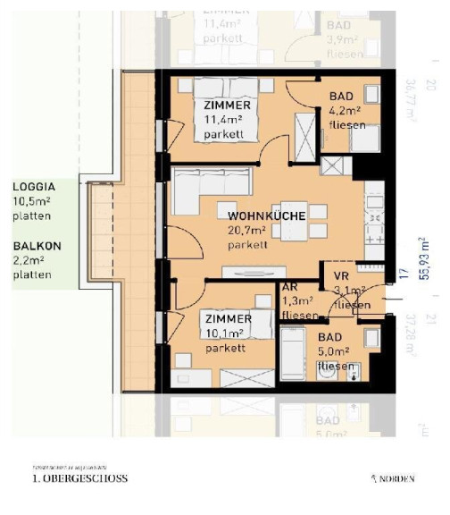 Sollten Sie mehr Platz benötigen, planen wir auch gerne eine größere Wohnung (zB eine 4-Zimmer-Wohnung anstelle von zwei nebeneinander liegenden 2-Zimmer-Wohnungen) für Sie. Fragen Sie einfach bei unserem Vertrieb nach!