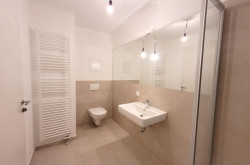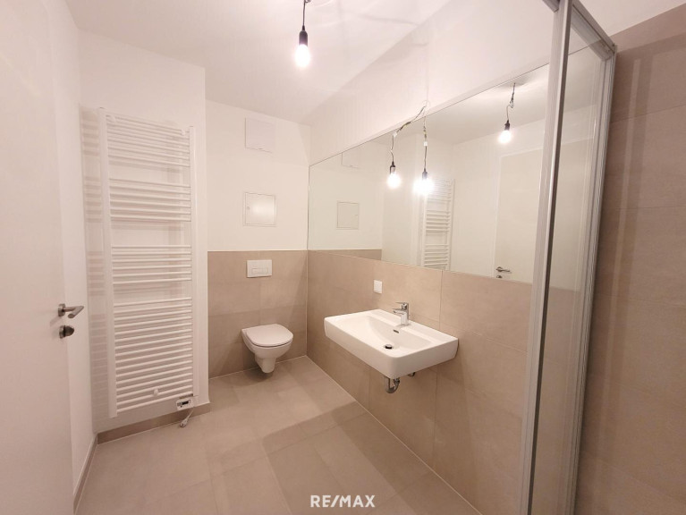 - Bad mit Dusche und WC, modern mit großen Fliesen und schönen Armaturen, Waschmaschinenanschluss