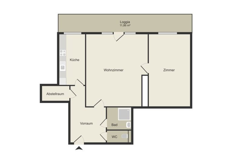 Diese 2-Zimmer-Wohnung befindet sich im 3. Obergeschoss eines Mehrparteienhauses aus den 1960er-Jahren und überzeugt durch ihre klare Raumaufteilung und die großzügige Loggia. Vom zentralen Vorraum aus sind sämtliche Räume getrennt begehbar – Wohnzimmer mit Zugang zur Loggia, Schlafzimmer, separate Küche, Badezimmer und WC. Zusätzlich steht ein praktischer Abstellraum zur Verfügung. Die straßenseitig ausgerichtete Loggia bietet Ausblick über die Stromstraße und erweitert den Wohnraum um fast 12 m².
