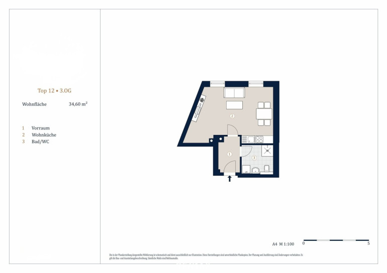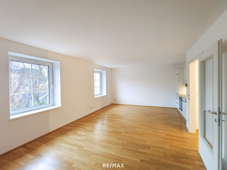 Der offen konzipierte Wohn-, Schlaf- und Essbereich bietet eine klare, gut nutzbare Raumstruktur und ausreichend Platz für modernes Wohnen. Die großflächigen Fenster sorgen für ein angenehmes, natürliches Licht und einen freien Blick ins Grüne. Das Badezimmer ist funktional ausgestattet und verfügt über Dusche, WC sowie einen Waschmaschinenanschluss.