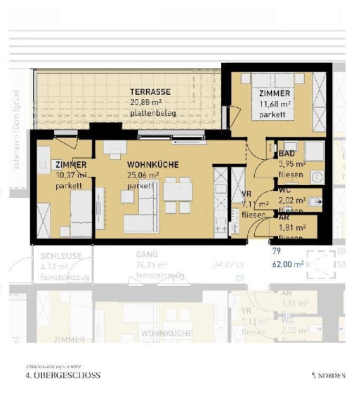 Sollten Sie mehr Platz benötigen, planen wir auch gerne eine größere Wohnung (zB eine 4-Zimmer-Wohnung anstelle von zwei nebeneinander liegenden 2-Zimmer-Wohnungen) für Sie. Fragen Sie einfach bei unserem Vertrieb nach!