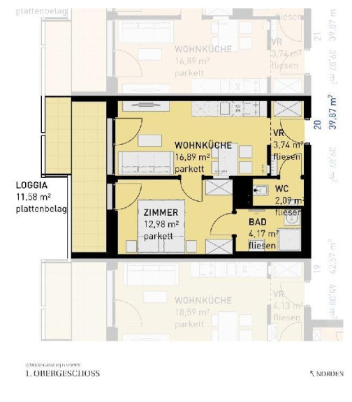 Sollten Sie mehr Platz benötigen, planen wir auch gerne eine größere Wohnung (zB eine 4-Zimmer-Wohnung anstelle von zwei nebeneinander liegenden 2-Zimmer-Wohnungen) für Sie. Fragen Sie einfach bei unserem Vertrieb nach!