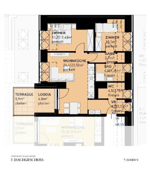 Sollten Sie mehr Platz benötigen, planen wir auch gerne eine größere Wohnung (zB eine 4-Zimmer-Wohnung anstelle von zwei nebeneinander liegenden 2-Zimmer-Wohnungen) für Sie. Fragen Sie einfach bei unserem Vertrieb nach!