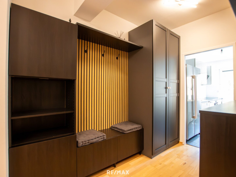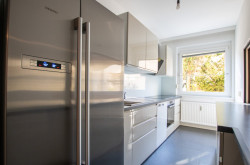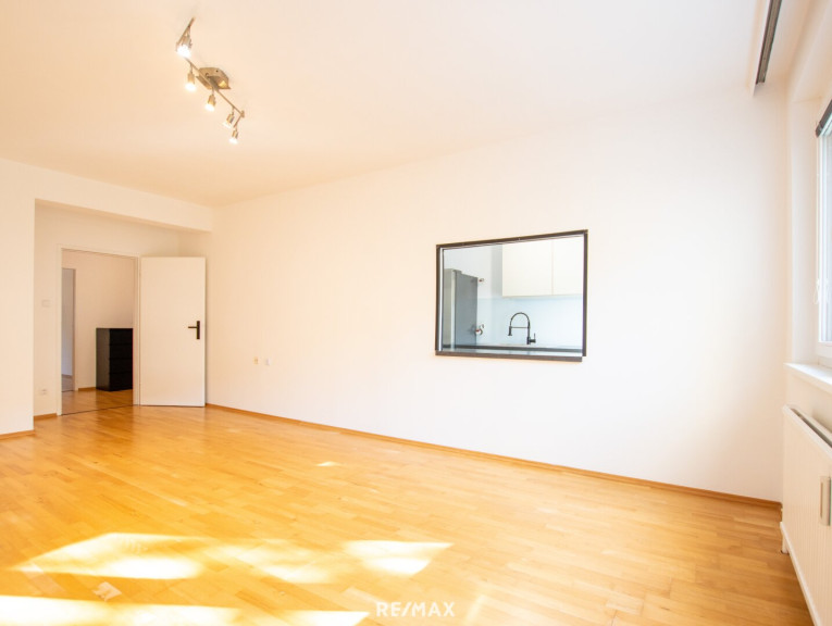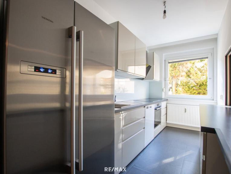 Das großzügige Wohn- Esszimmer bildet das Herzstück der Wohnung und besticht durch seine Helligkeit und angenehme Wohnqualität. Die beiden weiteren Zimmer- ein Schlafzimmer, sowie ein Kinderzimmer oder Büro, sind ruhig zur Rückseite der Anlage ausgerichtet und bieten einen schönen Blick ins Grüne. Die moderne, neuwertige Küche ist mit hochwertigen Markengeräten, sowie einem großen Kühlschrank ausgestattet und lässt keine Wünsche offen. Besonders praktisch und zugleich kommunikativ ist die Durchreiche ins Wohnzimmer, die den Alltag erleichtert und sich ideal beim Bewirten von Gästen eignet. Abgerundet wird das Raumangebot durch eine stilvoll gestaltete Garderobe mit ausreichend Stauraum. Die Wohnung wurde vor kurzem renoviert und ist sofort beziehbar. Neue Fenster sowie Sonnenschutzrollos sorgen zusätzlich für Komfort und ein angenehmes Wohnklima.