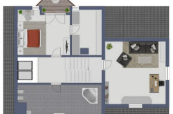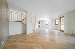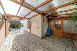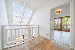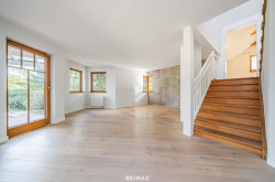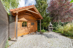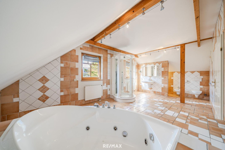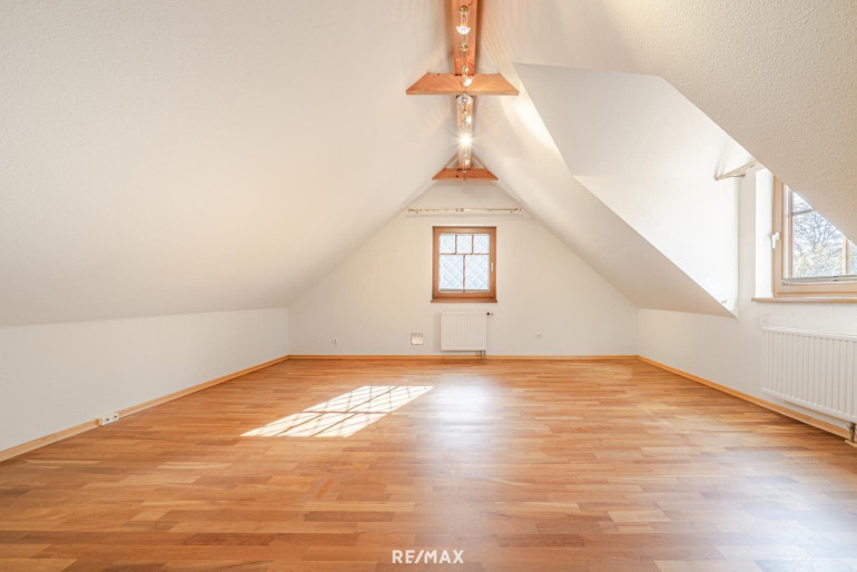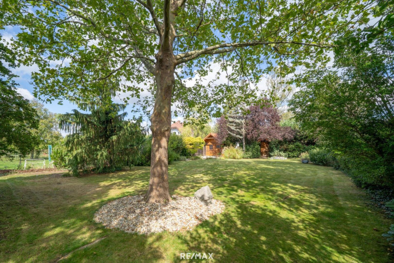 Das Wohn- und Esszimmer bildet mit rund 43 m² das Herzstück des Hauses. Der besondere Grundriss, der Blick ins Grüne, die offene Galerie und der Kaminanschluss für Ihren Holzofen schaffen ein Ambiente, das Wärme und Geborgenheit ausstrahlt, perfekt für entspannte Abende mit Familie und Freunden. Die angrenzende, überdachte Terrasse lädt auch bei Regen zum Verweilen im Freien ein. Vom Wohn-/Esszimmer aus, führt eine Treppe zuerst in den Halbstock, wo sich ein ca. 30 m² großer, ausgebauter Dachboden befindet. Anschließend führt die Treppe ins Obergeschoss mit einem 20 m² großem Badezimmer mit Badewanne und Dusche. Über die offene Galerie gelangen Sie auch in das Hauptschlafzimmer mit eigenem Balkon und Schrankraum. Von hier aus genießen Sie einen herrlichen Blick in den Garten. Der Garten selbst ist ein echtes Highlight. Liebevoll gestaltet, mit altem Baumbestand, kleinem Teich, Brücke, Grillplatz und einer komplett ausgestatteten Gartenhütte. Ein idyllischer Rückzugsort für entspannte Stunden im Grünen.