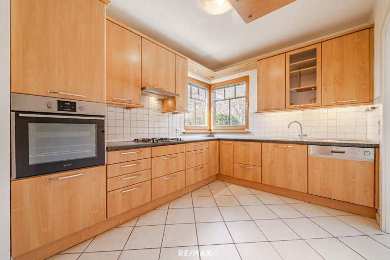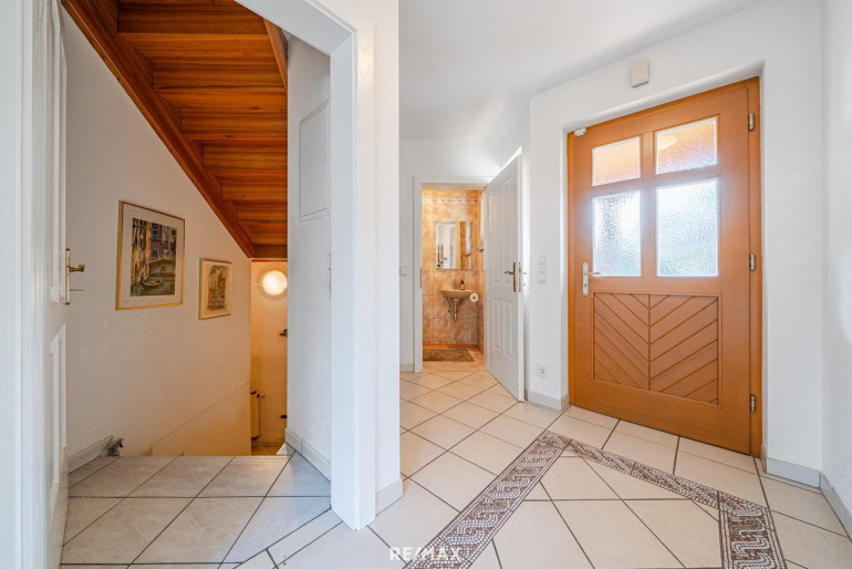 Bereits beim Betreten spüren Sie den besonderen Charme dieser Immobilie, die gelungene Kombination aus architektonischem Charakter, Offenheit und Licht verleiht dem Haus eine warme, einladende Atmosphäre. Der Vorraum bietet ausreichend Platz für Ihre Garderobe und ermöglicht einen direkten Zugang, sowohl zum Haus, als auch zur Garage – ideal, um Einkäufe bequem ins Haus zu bringen. Die Küche ist gepflegt, verfügt über alle nötigen Geräte und bietet auch die Möglichkeit einen großen Kühlschrank zu integrieren (Kühlschrank ist nicht inkludiert).