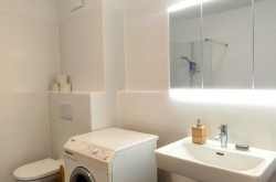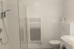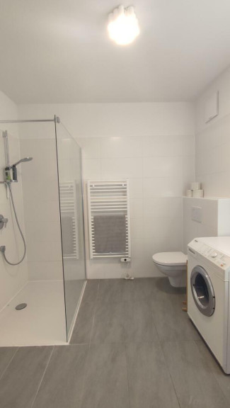 modernes, großes Badezimmer mit einer Walkin Dusche, einem WC und einem Waschmaschinenanschluss,