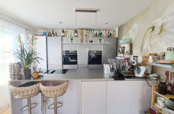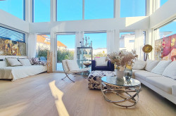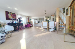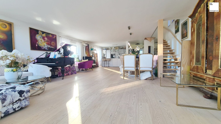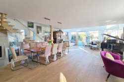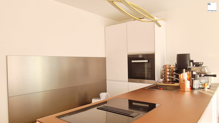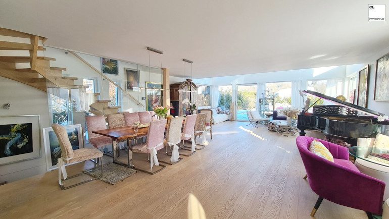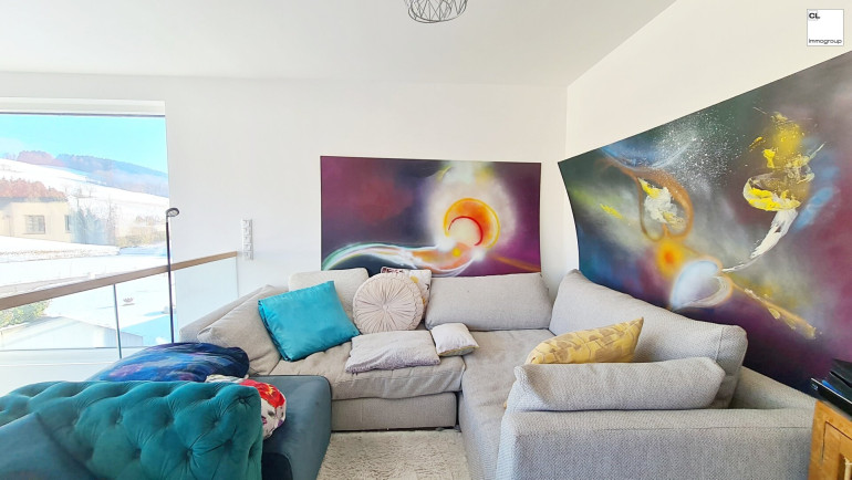 Licht & Raum: Große Glasflächen im Erd- und Obergeschoss und die offene Galerie schaffen ein helles, luftiges Wohnambiente, das sofort begeistert. Der über 70 m² große luftige Raum im Erdgeschoss, ausgestattet mit einer modernen Küche, bietet viel Platz für Ihre individuelle Gestaltung. Von hier aus gelangen Sie auf die sonnige Poolterrasse und den liebevoll angelegten Garten.