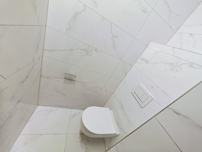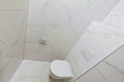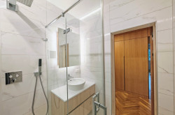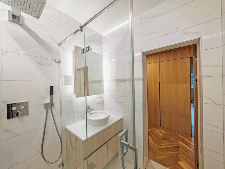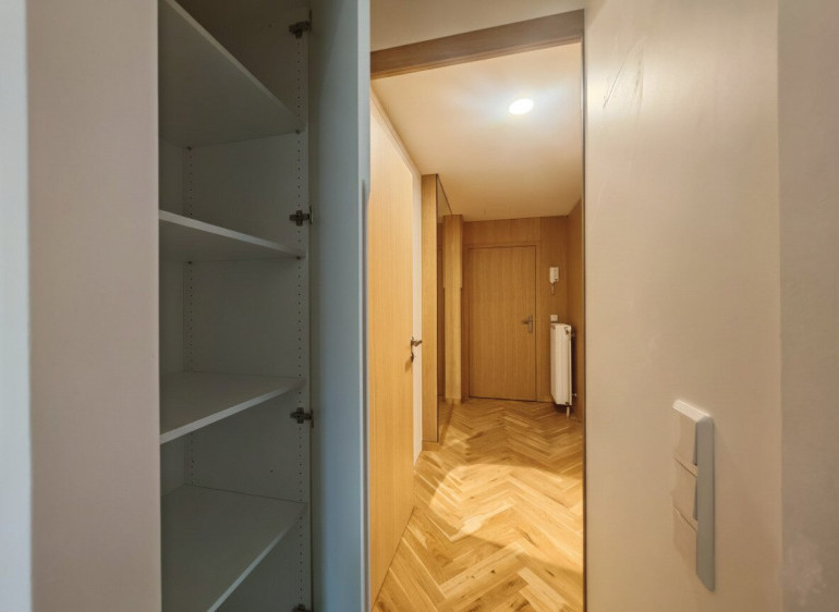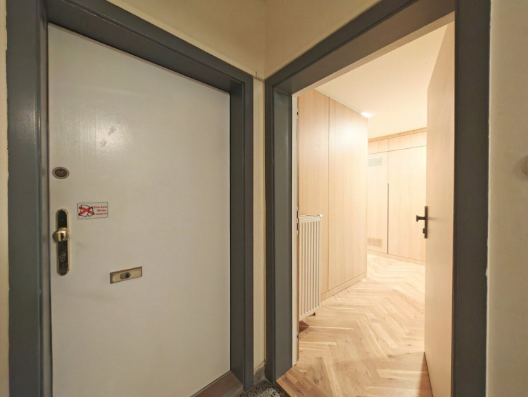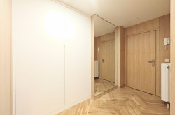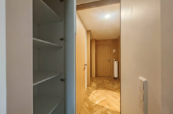 Das gesamte Vorzimmer ist mit Holzvertäfelung ausgestattet, wodurch Zimmertüren und Stauraumlösungen harmonisch in die Wandgestaltung integriert werden. Dies sorgt für ein hochwertiges und zugleich wohnliches Ambiente. Die Raumaufteilung ist besonders effizient: Es wurden Garderoben sowie separate Schränke für Therme und Waschmaschine geschaffen, um jeden Quadratmeter optimal zu nutzen.