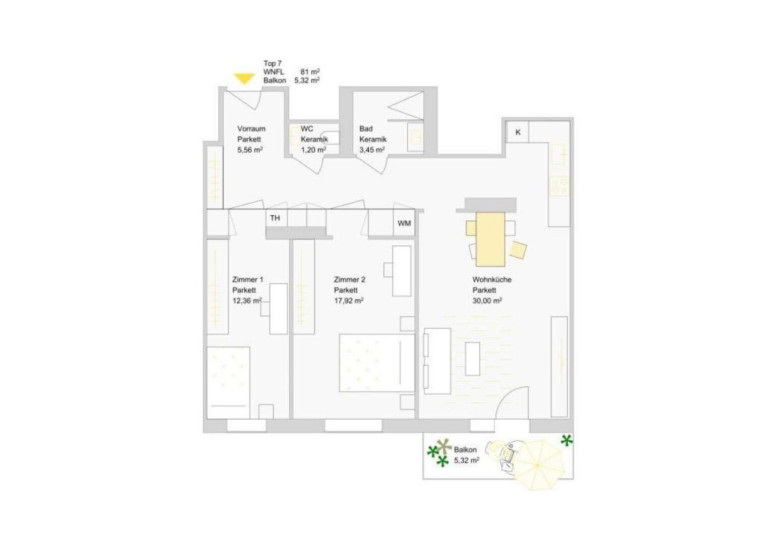Auf einer Fläche von rund 81 m² befinden sich zwei Schlafzimmer, ein offen gestaltetes Wohnzimmer mit Übergang zum Vorzimmer und zur Küche, ein WC sowie ein Duschbad.