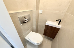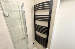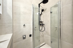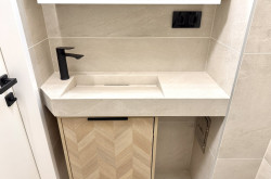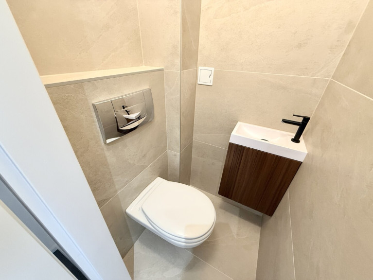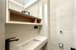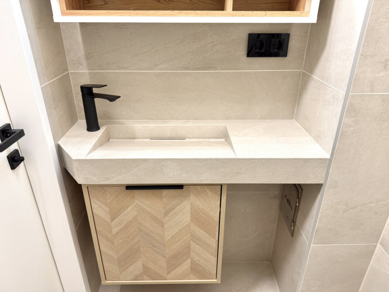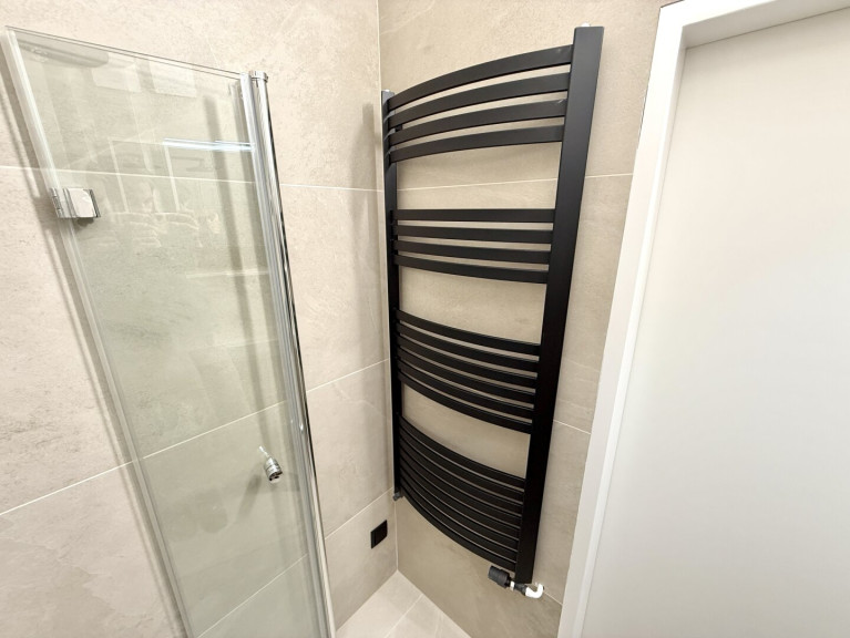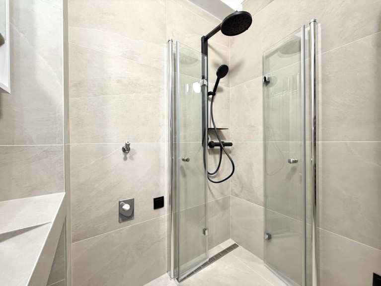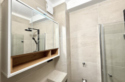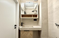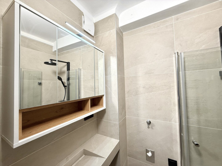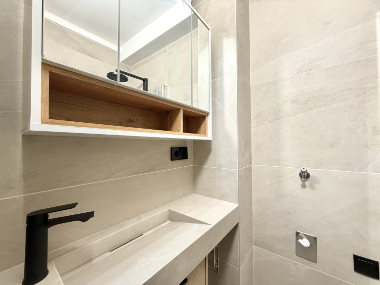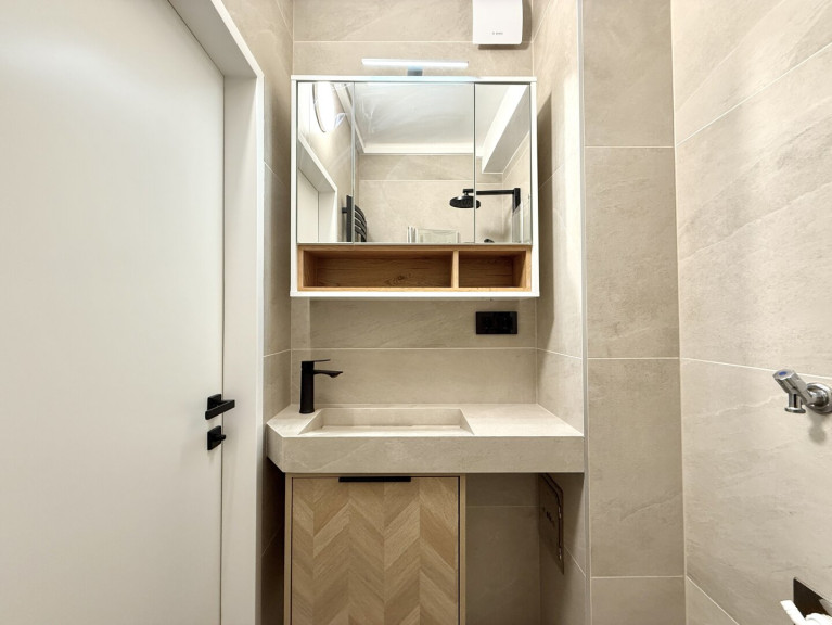 Das modern gestaltete Badezimmer ist kompakt, aber durchdacht: Es verfügt über eine Eckdusche, ein Maßwaschbecken, einen Spiegelschrank sowie einen Anschluss für eine kleinere Waschmaschine.