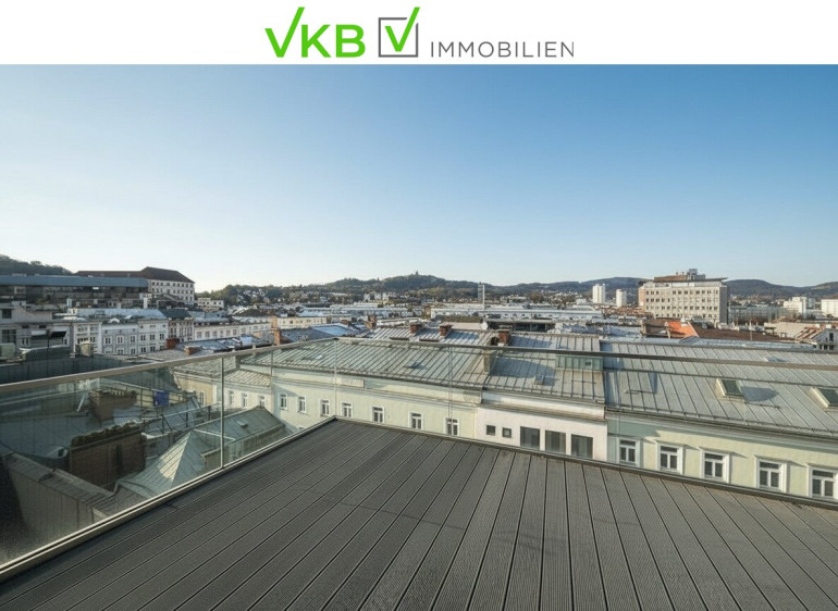 Im oberen Geschoss befindet sich das absolute Highlight der Wohnung: eine großzügige Dachterrasse mit traumhaftem Ausblick auf den Pöstlingberg – perfekt für entspannte Stunden oder gesellige Abende.