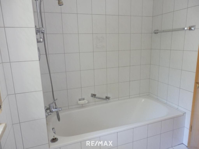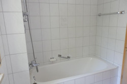 Badewanne und WC, sowie ein Wohn-/Essbereich, von dem man auf den überdachten Südbalkon kommt.