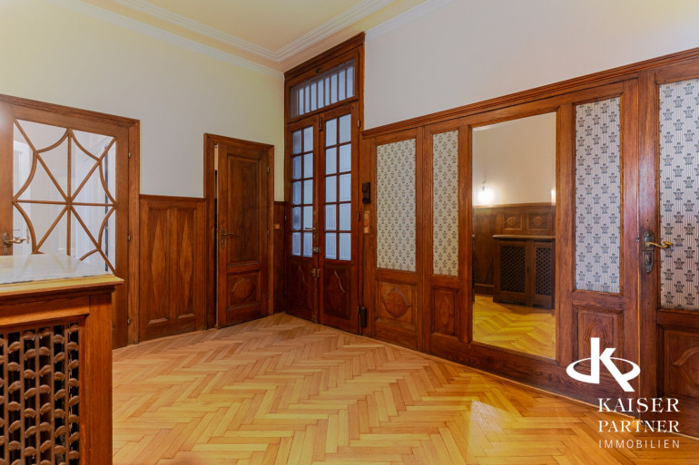 - Zwei Salon-Zimmer mit jeweils ca. 30m² verfügen über den originalen, eleganten Stilparkett; eines dieser Zimmer ist zudem mit einem offenen Kamin ausgestattet.