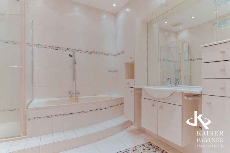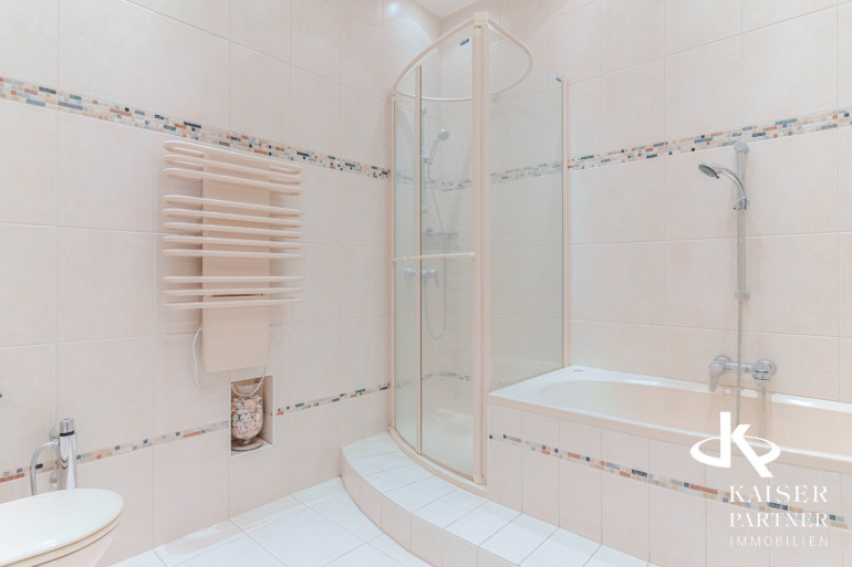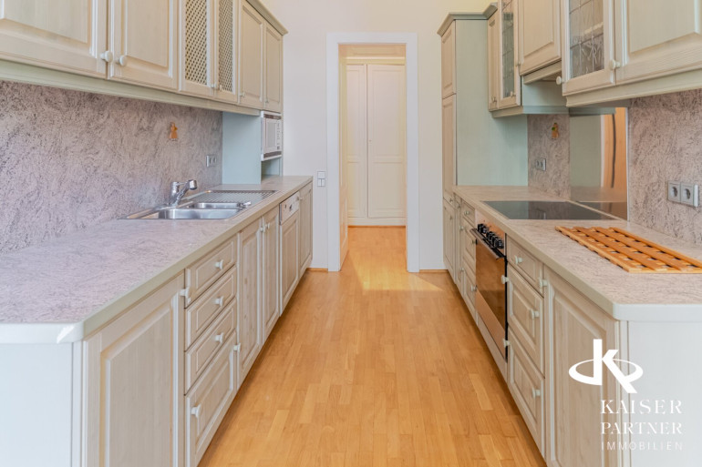 Neben Stuckdecken und Stiltüren verfügt die Wohnung über eine möblierte Küche, inklusive Essbereich. Für höchsten Komfort sorgt ein Badezimmer mit Wanne und ein separates Badezimmer mit Dusche. Ein eigener Schrankraum sowie ein Abstellraum runden das Platzangebot ab.