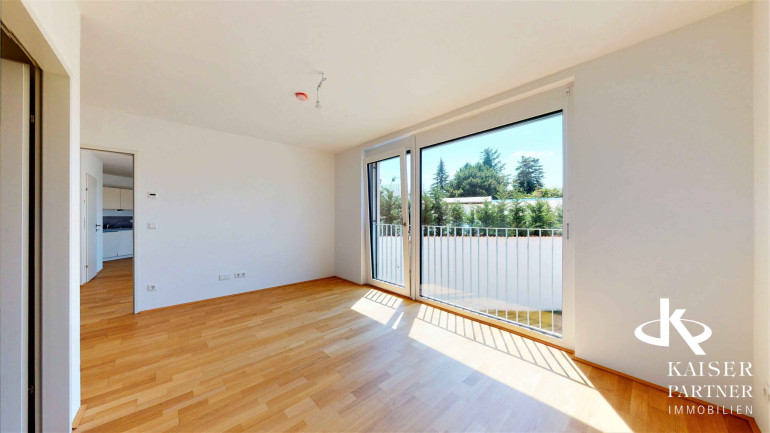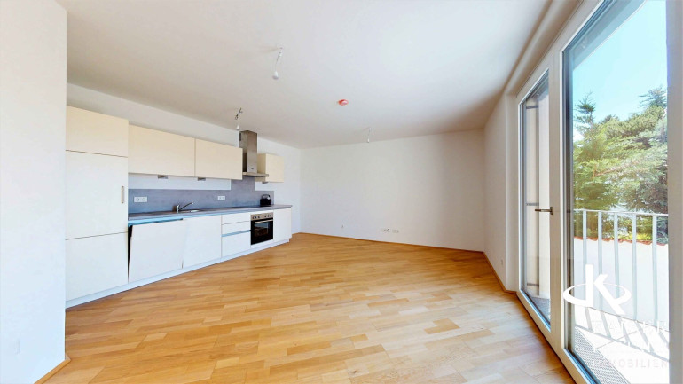 Die Wohnung besticht durch ihren durchdachten Grundriss, der ein helles und freundliches Wohnzimmer mit offener Einbauküche umfasst. Die hochwertige Einbauküche ist bereits vorhanden und lädt zum gemeinsamen Kochen und Verweilen ein. Von hier aus gelangen Sie direkt auf den sonnigen Balkon, der einen herrlichen Grünblick bietet und zum Entspannen im Freien einlädt.