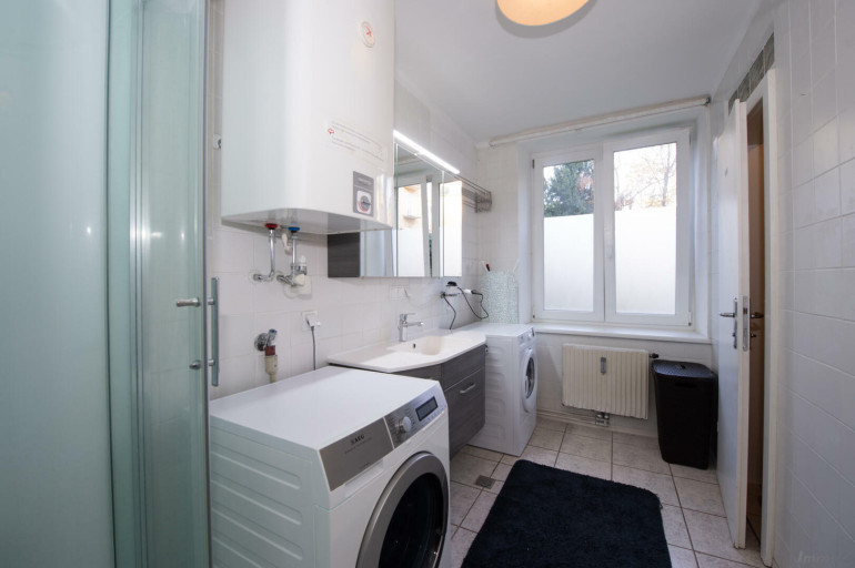 Ein Badezimmer mit Dusche und Fenster sorgt für angenehmes Tageslicht und gute Belüftung. Ergänzt wird die Wohnung durch zwei separate WCs, einen praktischen Abstellraum sowie ein eigenes Kellerabteil.
