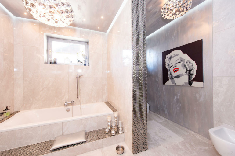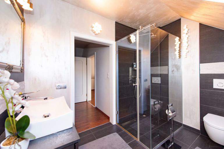 - Zwei Badezimmer mit hochwertiger Ausstattung sowie eine praktische Waschküche mit Dusche und WC im Untergeschoss.